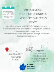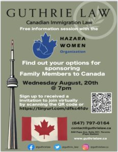 سازمان زنان هزاره شما را به یک جلسه آنلاین با یک وکیل باتجربه دعوت میکند تا به تمام سوالات شما در مورد اسپانسر اعضای خانواده به کانادا پاسخ دهد. لطفاً با اسکن بارکد ثبت نام کنید. در صورت نیاز به کمک در ثبت نام با شماره 416-836-4316 برای من پیام ارسال کنید.